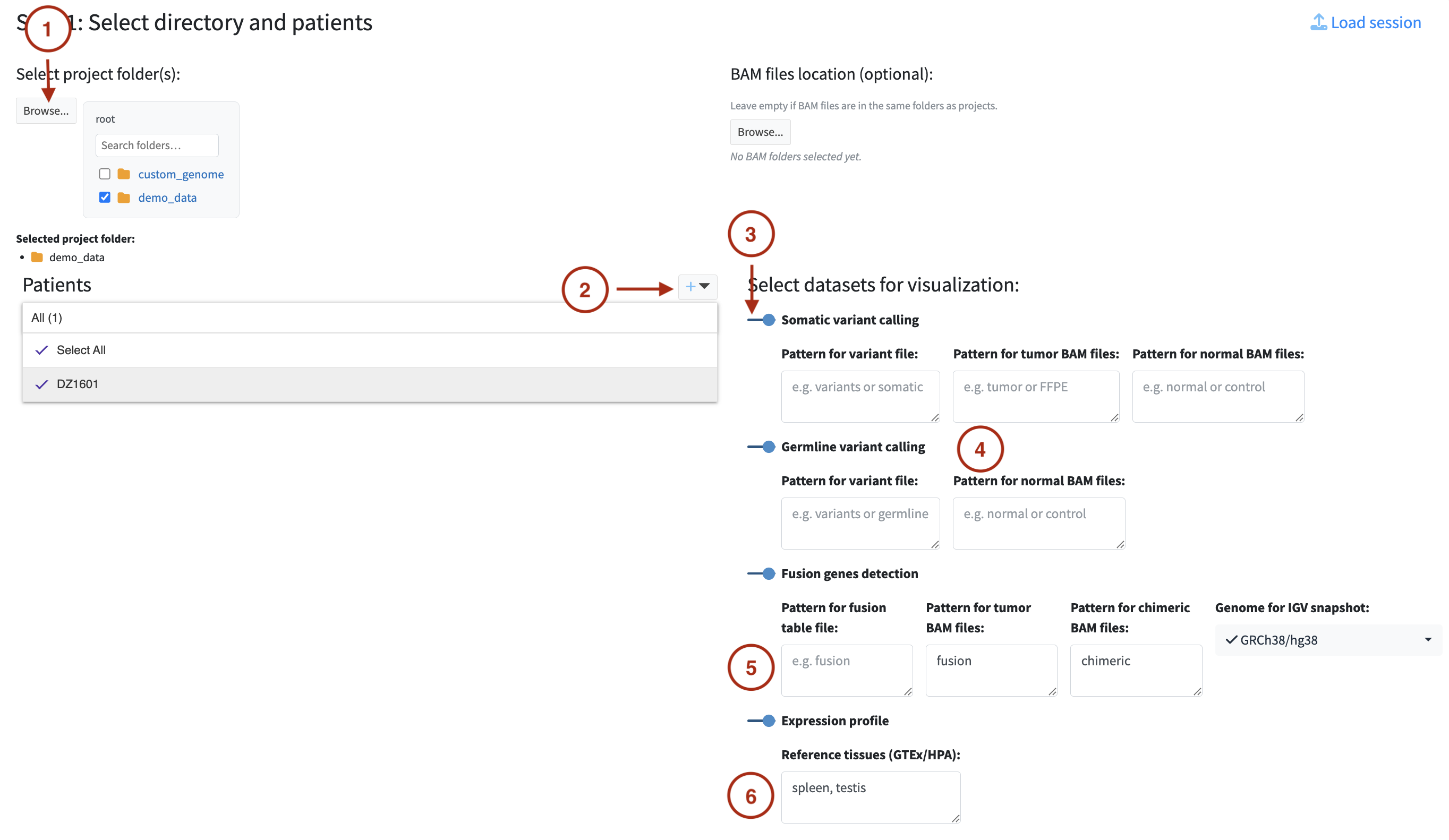 - Select all datasets (Somatic variant calling, Germline variant calling, Fusion gene detection and Expression profile).