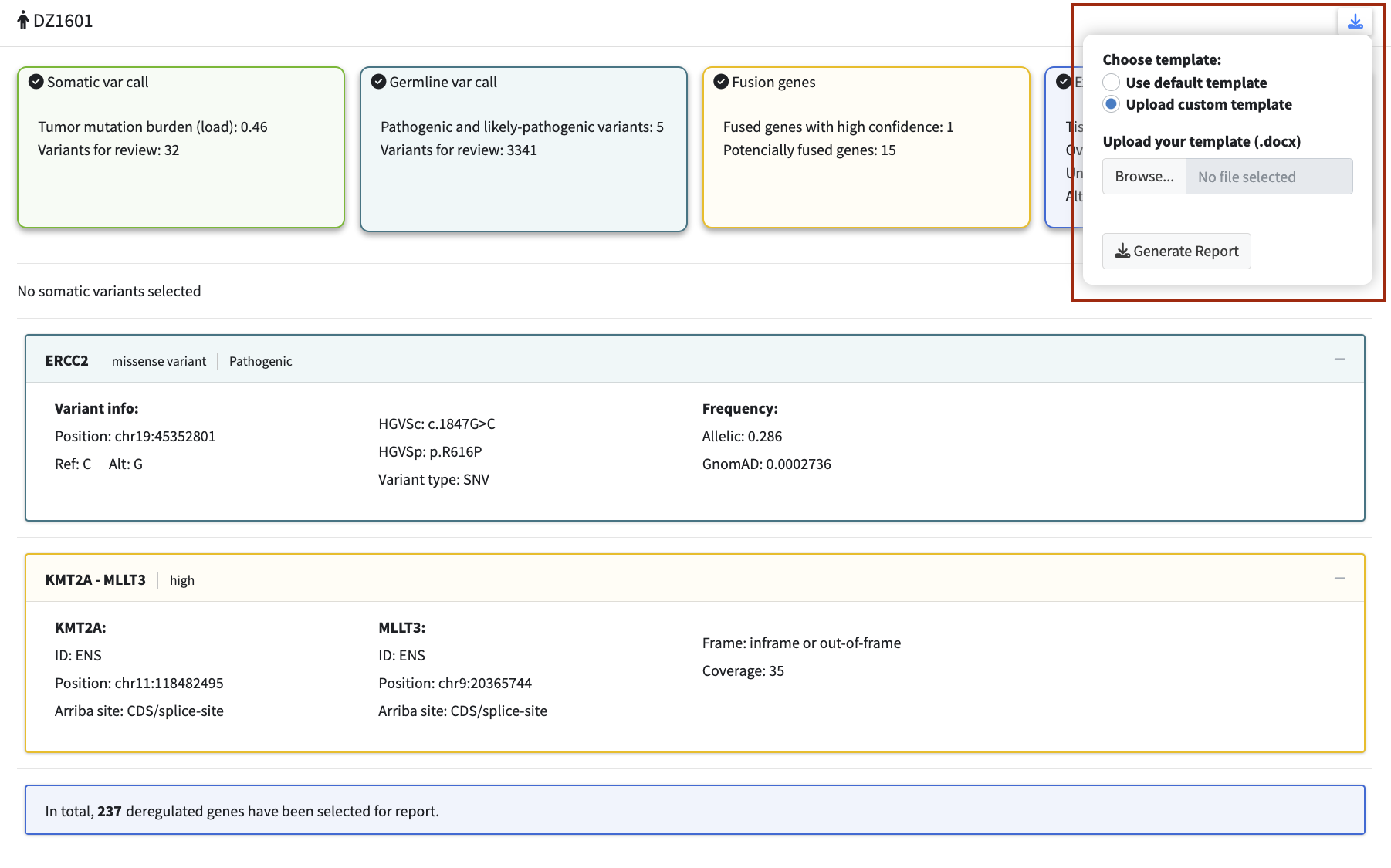 If a keyword is present in the template but no data is available for that section (e.g. no fusions were flagged), the placeholder is replaced with a default message rather than left empty. Keywords not present in the template are simply ignored.
