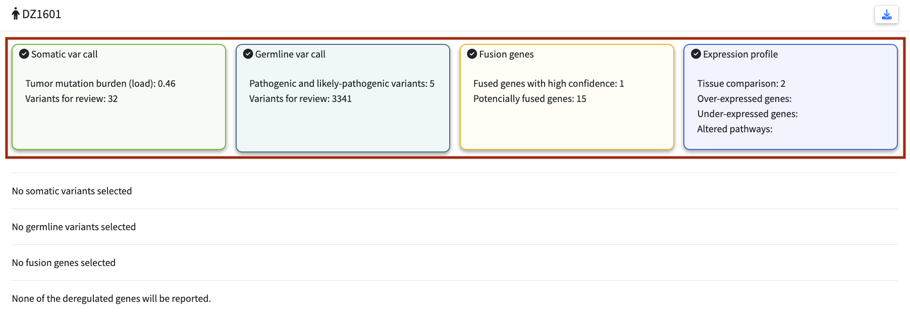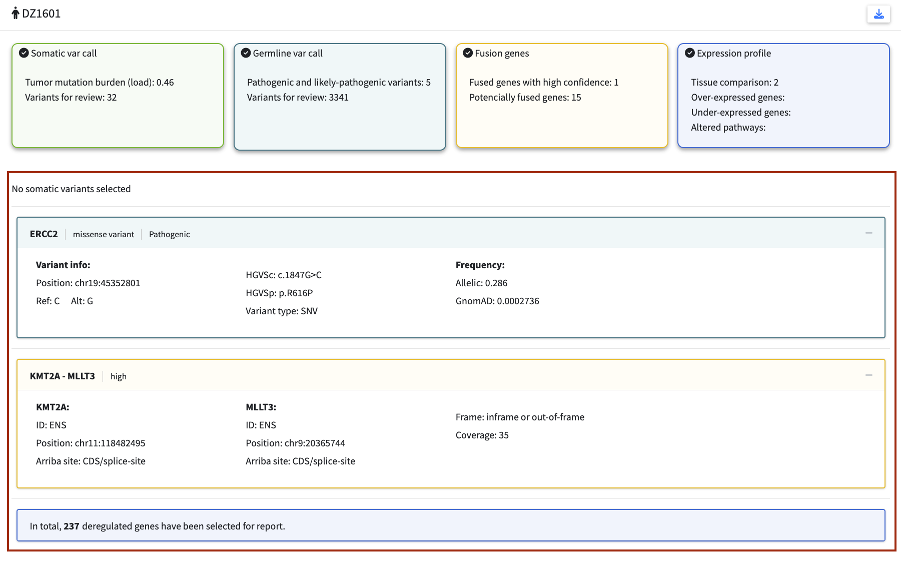 Below the overview boxes, all flagged variants, fusions, and genes from previous modules are displayed as expandable panels, one per dataset type.