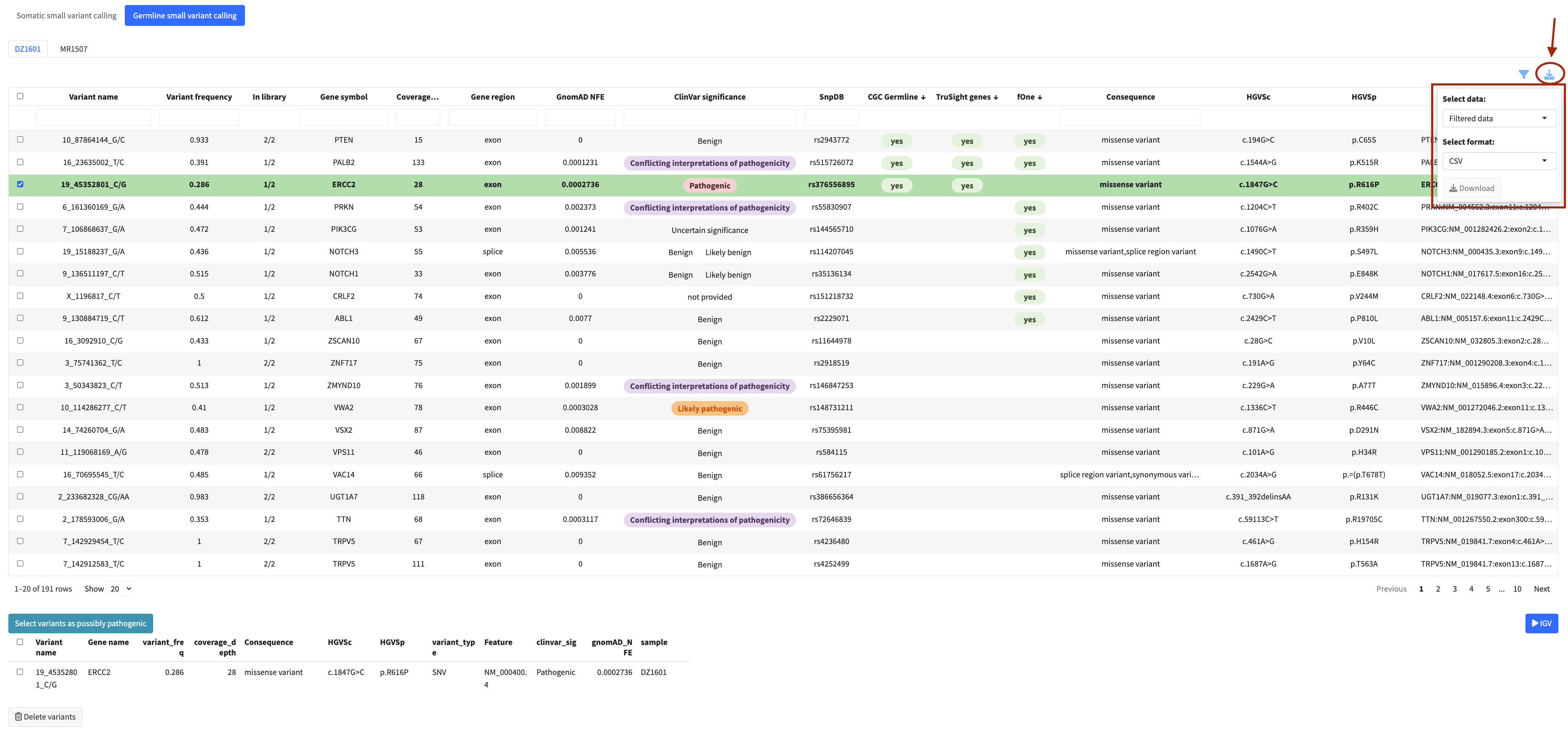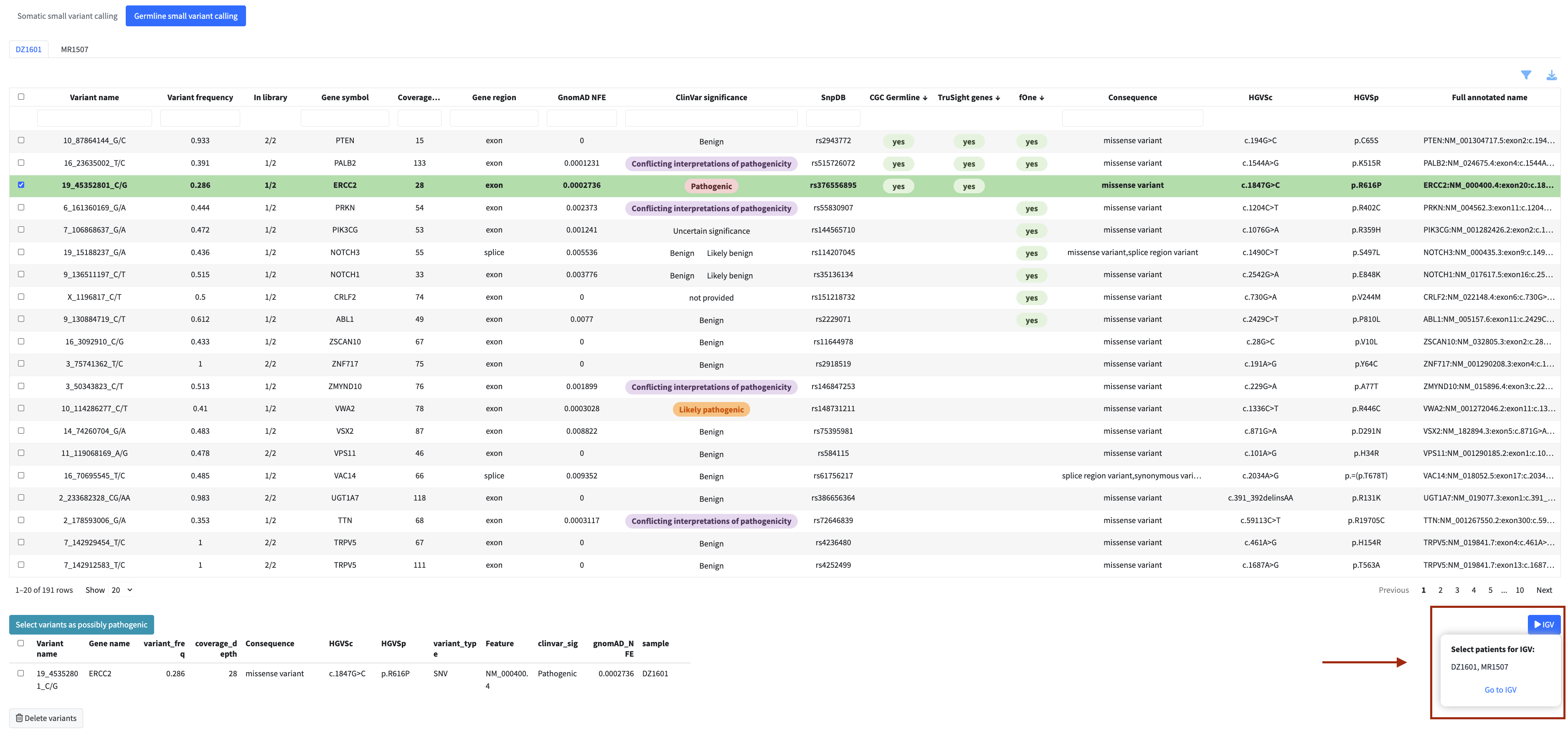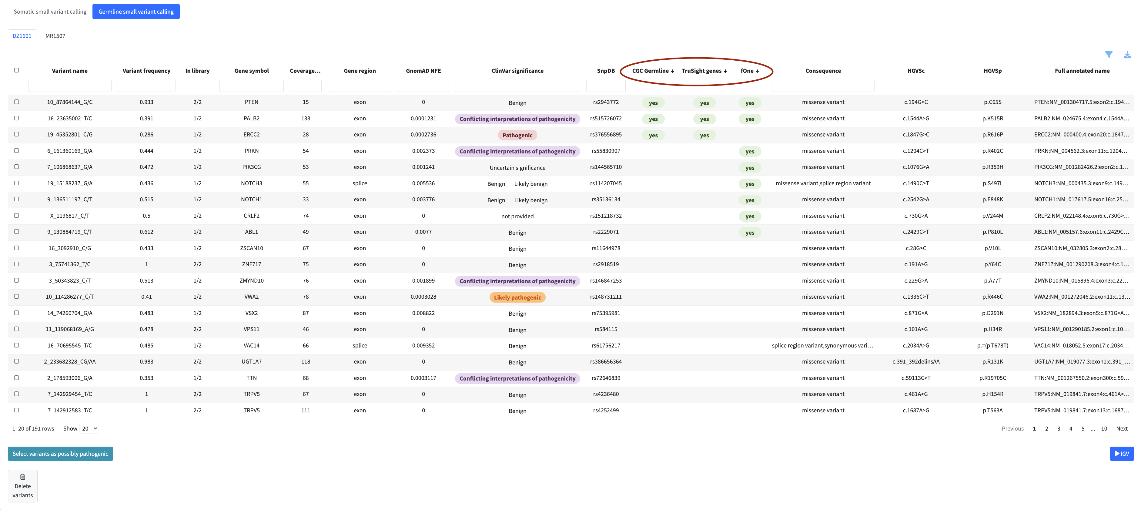 In each analysis module you can flag variants, fusions, or genes directly from the table for inclusion in the final clinical report. Flagged items appear in a dedicated review panel below the table where you can check your selection and remove items if needed.