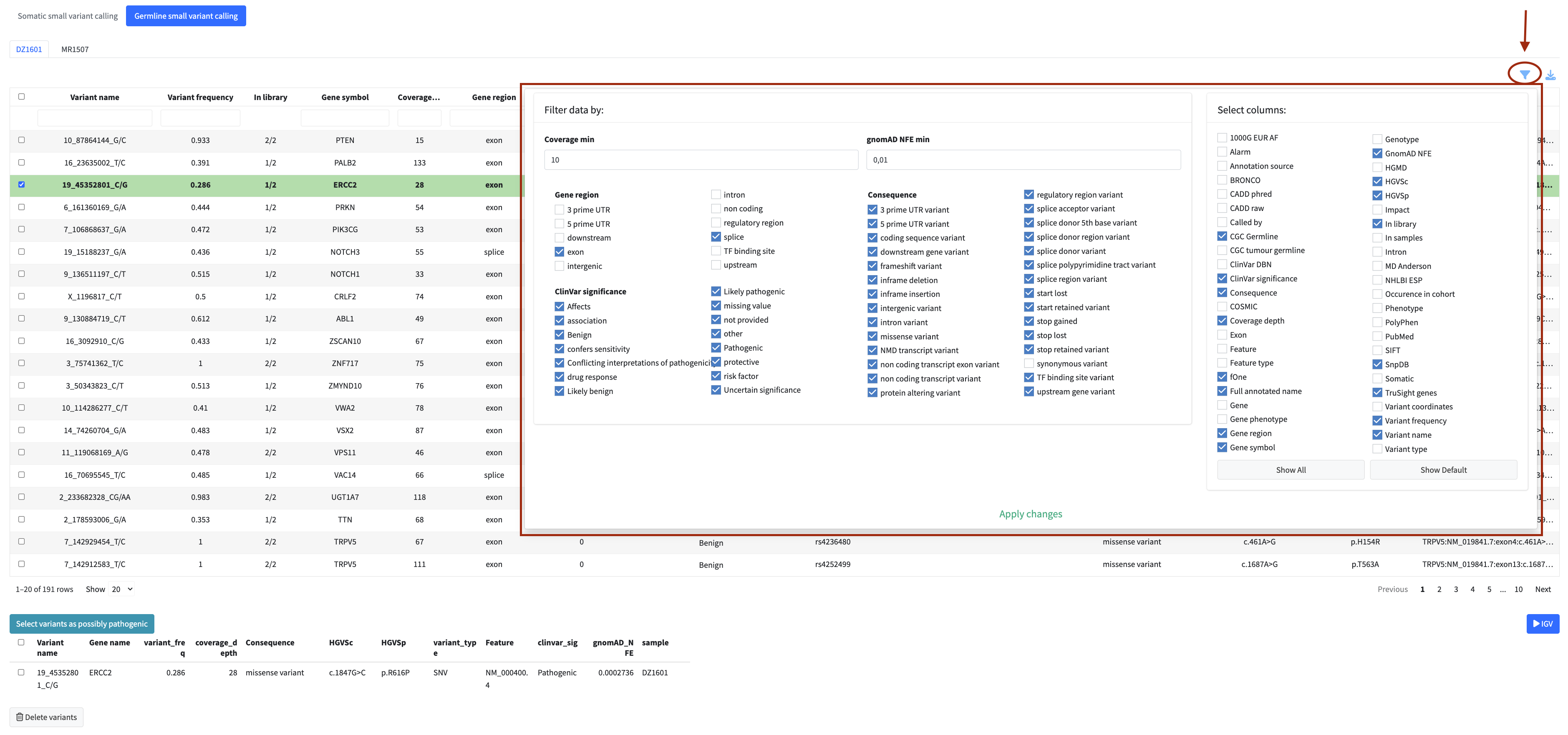 For somatic and germline variant calling, the default filters are the most restrictive — see Variant Calling — Default Filters for the exact criteria. For fusion gene detection and expression profile, default filters are less aggressive but the column selection in the filter menu may hide some columns by default.